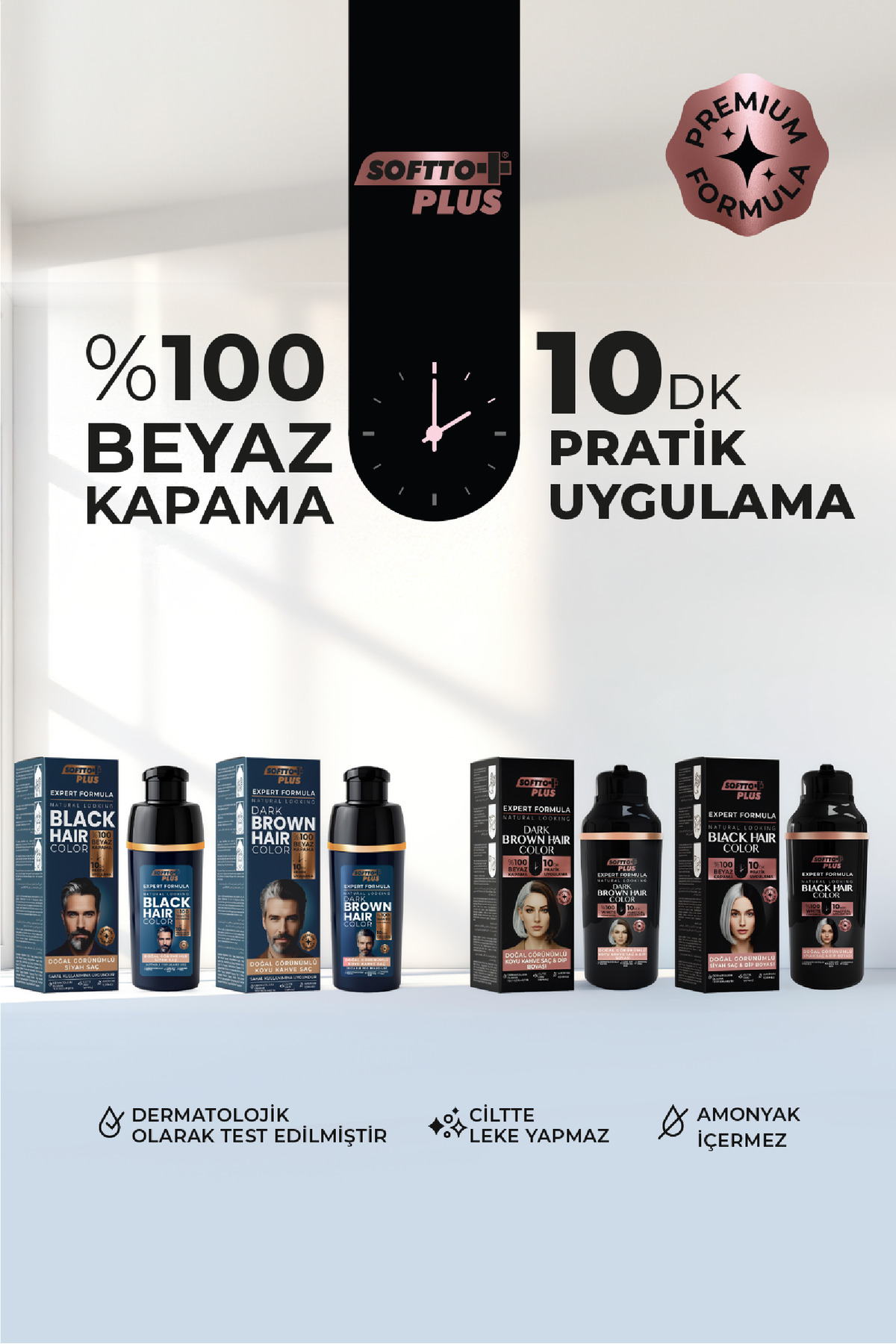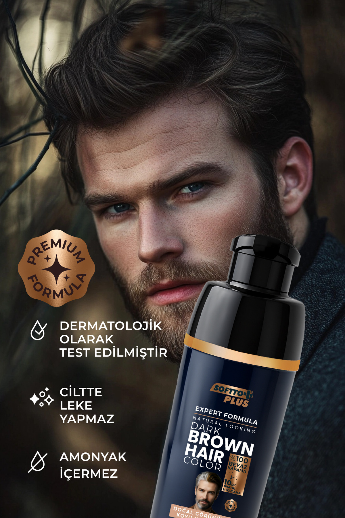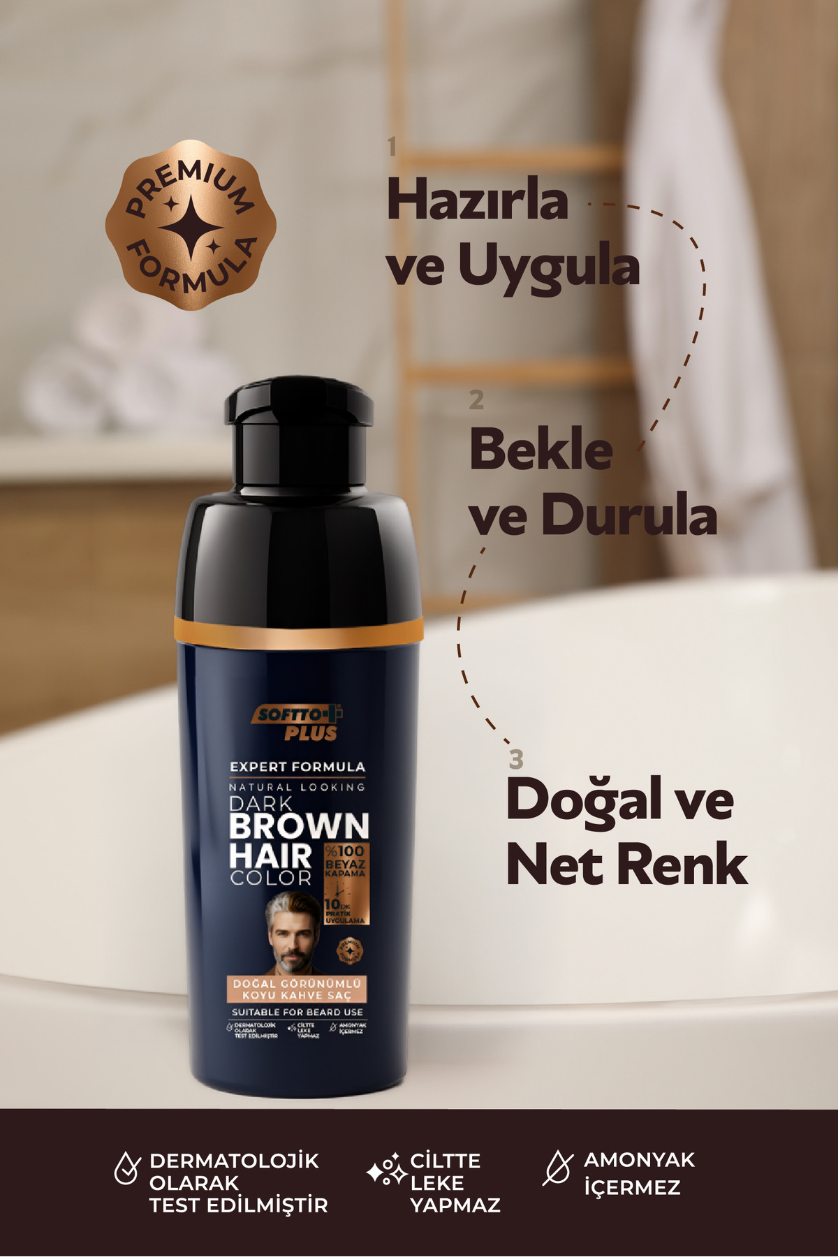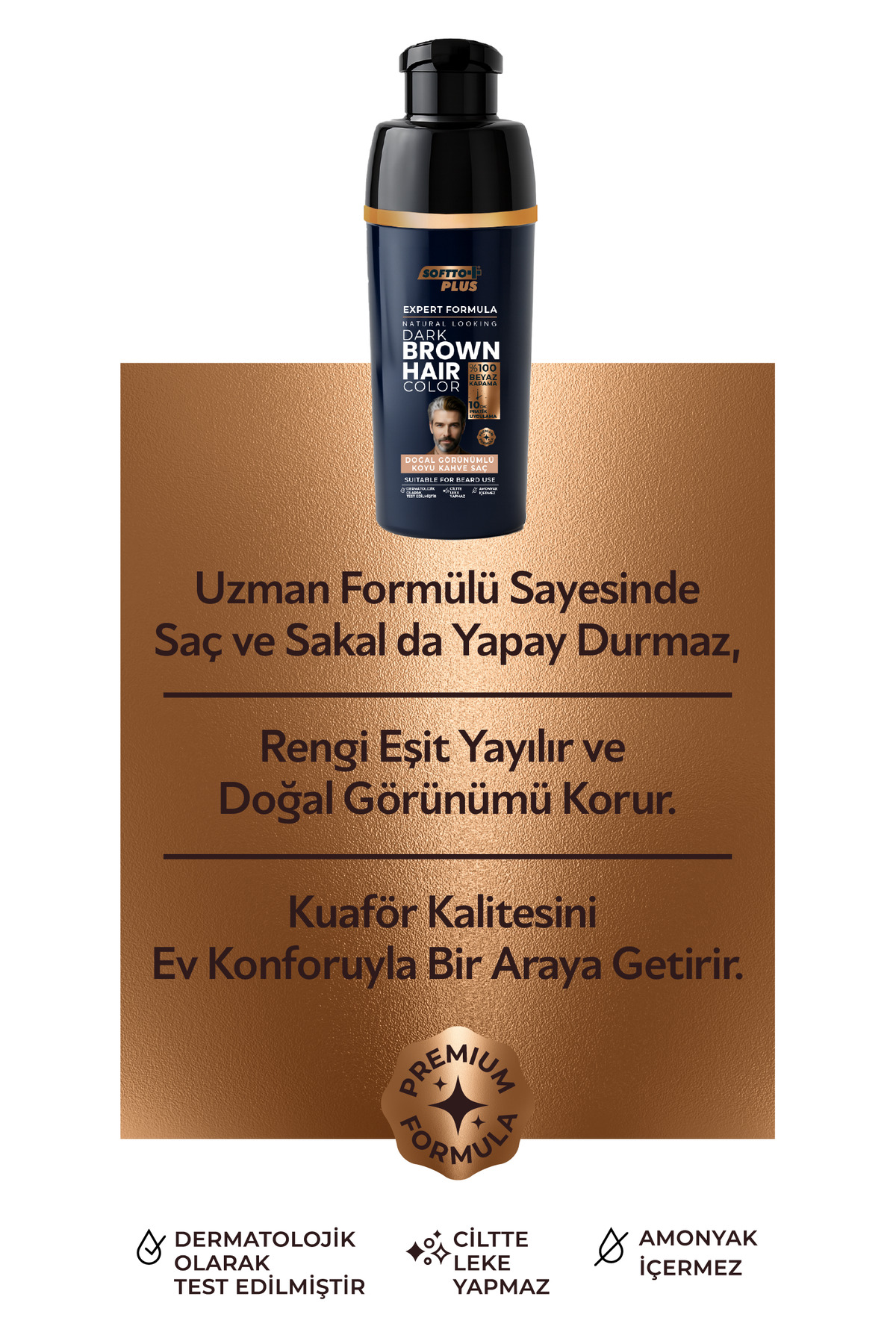 Softto Plus Expert Men Dark Brown Hair Color, erkekler için özel olarak geliştirilmiş formülüyle evde saç ve sakal uygulamasını hızlı, pratik ve güvenli hale getirir.